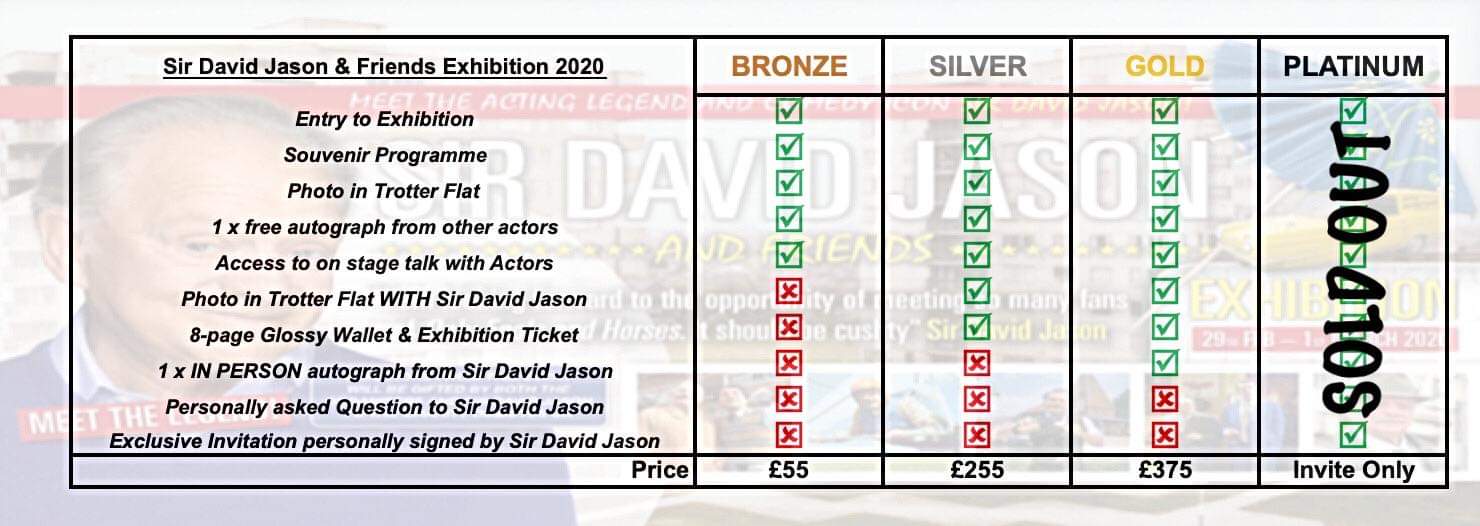 Here is the breakdown of ticket prices for the Sir David Jason & Friends Exhibition 2020